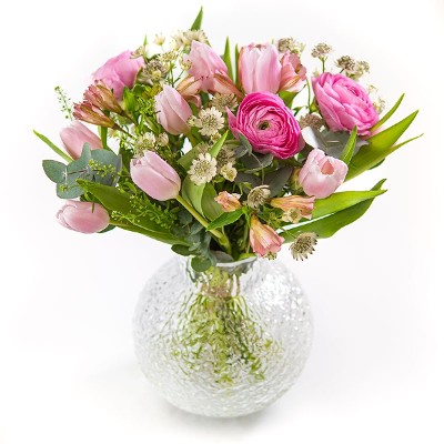 Starten Sie den Frühling mit einem schön pinken Blumenstrauß, gefüllt mit rosa Ranunkeln und Tulpen. Kombiniert mit saisonalem Grün wird dieser Strauß garantiert beeindrucken. Florale Handwerkskunst vom Feinsten. Jede Blume wird sorgfältig ausgewählt, um einen Strauß zu schaffen, der so schön wie erschwinglich ist.