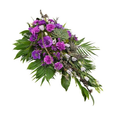 Drücken Sie Ihre Anteilnahme aus und senden Sie dieses elegante und warme Trauergesteck in lila Farbtönen. Eine reiche Blumenmischung wie Dianthus, Eustoma, Anemonen und Limonium sind eine Pracht!