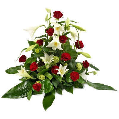 In liebevoller Erinnerung. Dieser klassische, aufrecht stehende Trauerstrauß vermittelt eine Vielzahl von Botschaften. Ein letzter Abschied ist immer schwer, aber mit diesem herzlichen Trauerstrauß mit weißen Lilien und roten Rosen machen Sie diesen letzten Gruß würdig! Unsere Floristen liefern das besondere Arrangement direkt zur Beerdigung.